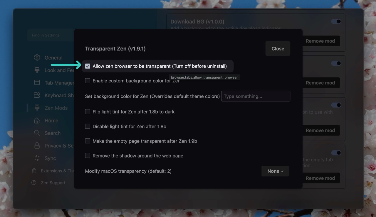 Then make sure the Allow zen browser to be transparent option is checked. (And if you are on Linux, you may see another toggle to be turned on as well). Enable other options if you like and then quit and re-open the zen browser to apply the changes.