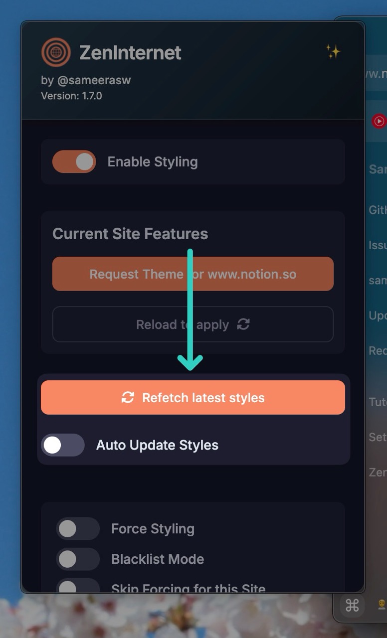 Open the addon pop-up and click on the Refetch latest styles button to fetch the initial styles and keep the auto update toggle on to keep them up to date as I make changes.