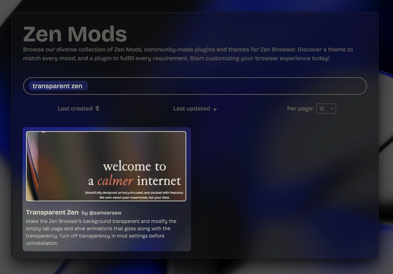 You can now enjoy the zen browser with a transparent background. You can also change adjust various features provided for each website when you opent he pop-up in that webpage.