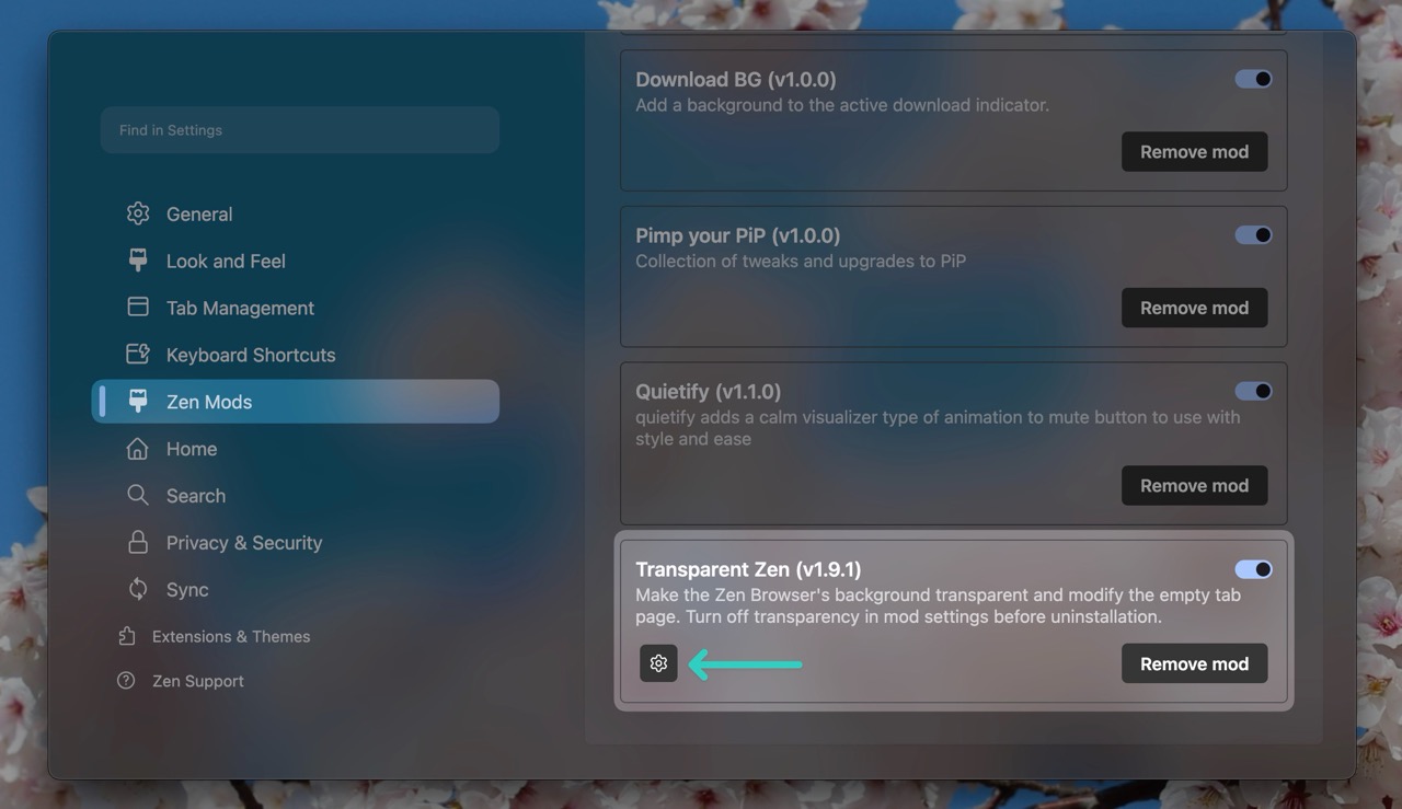 Once you have installed the mod, Go into Zen Browser settings > Mods > Transparent Zen and click on the Settings button.